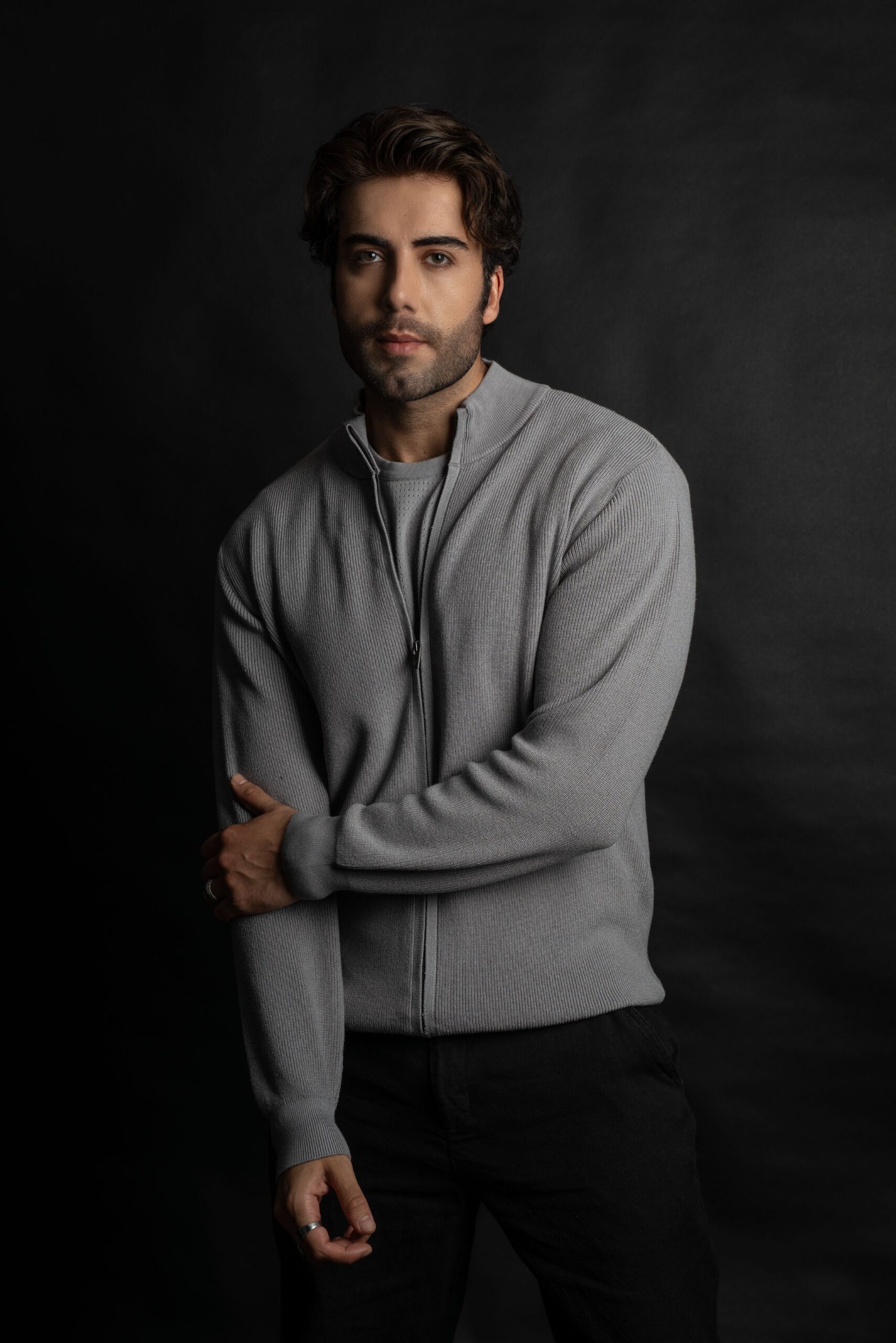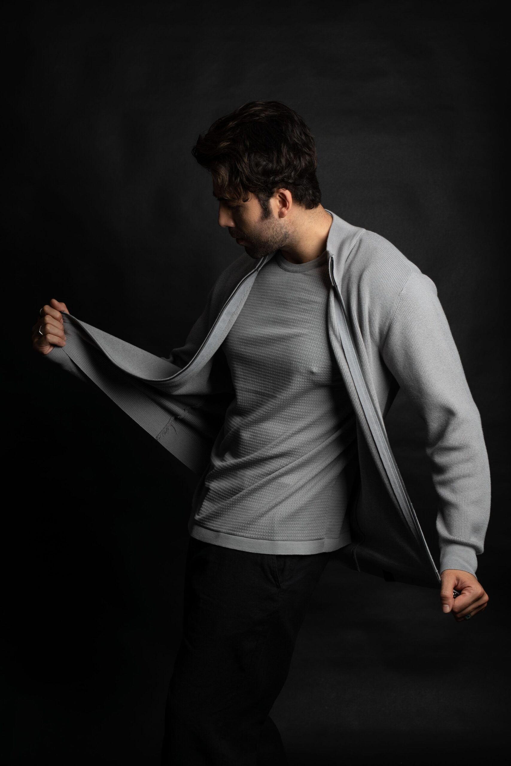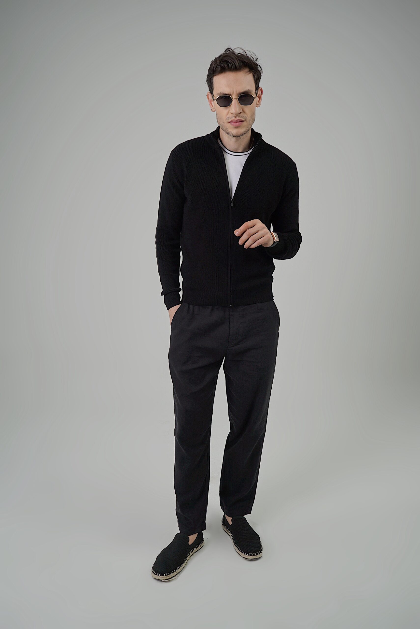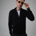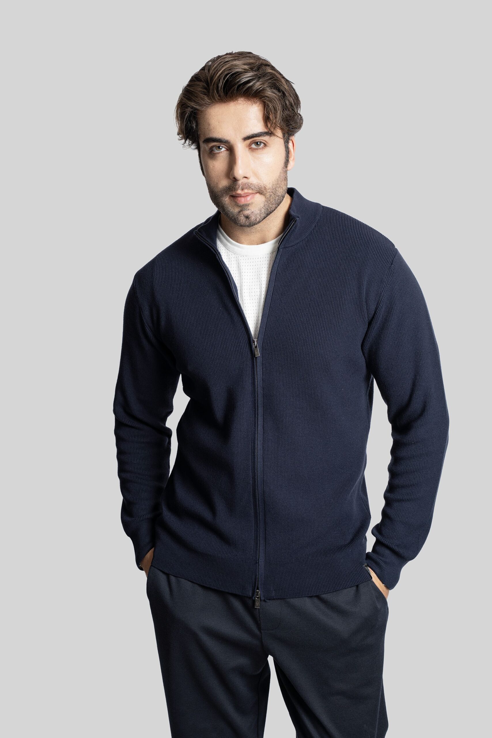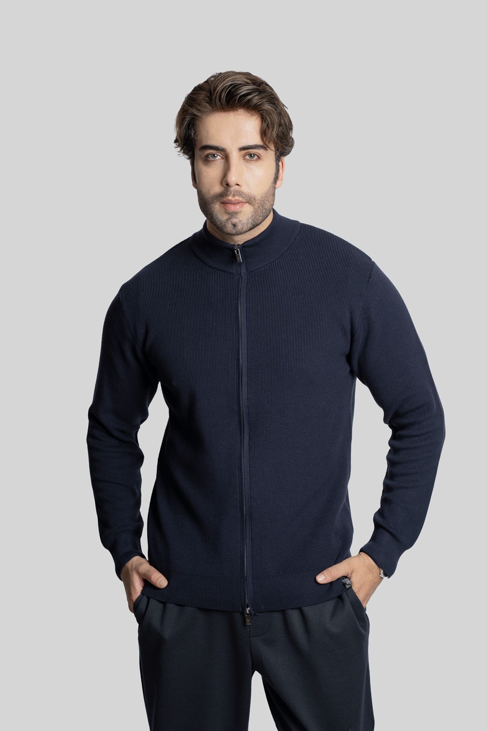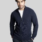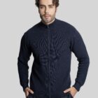- Cardigan da uomo realizzato con la tecnica di maglia a selanik, caratterizzato da collo alto e zip lunga frontale per una chiusura comoda e moderna.